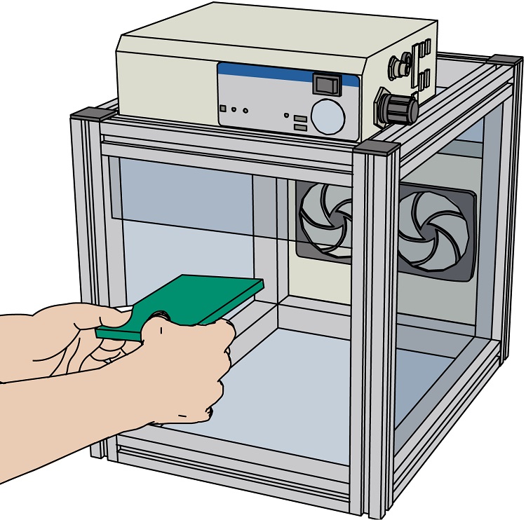 印字工程を改善するために、エアシリンダを利用したスタンプユニットを製作しました。このユニットを導入することで、印字作業を半自動化し、位置や濃淡を安定させることができました。その結果、作業者の負担が軽減されるとともに、製品の品質が向上しました。