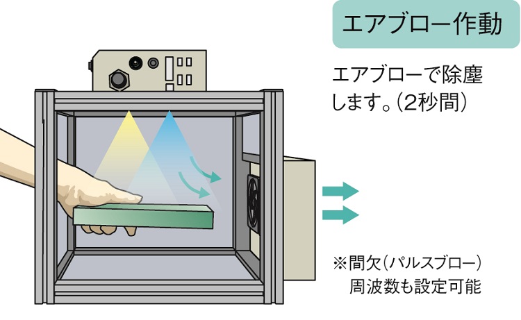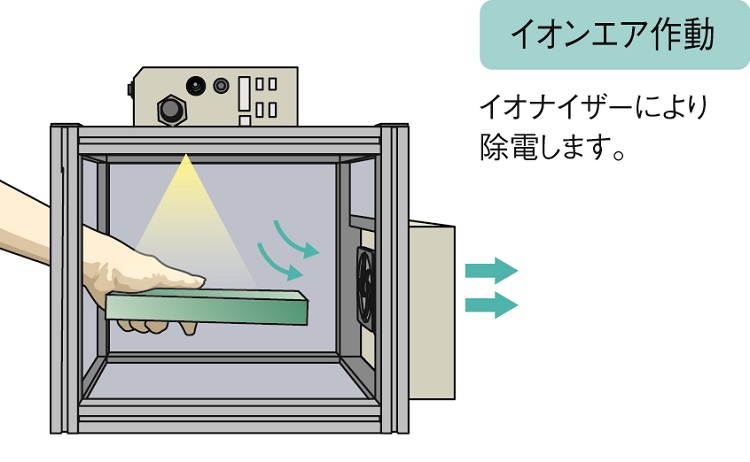 工程2: 仕上げ前の製品ラベル貼付時には、イオナイザーエアガンタイプを使用して除電作業を行っていました。
